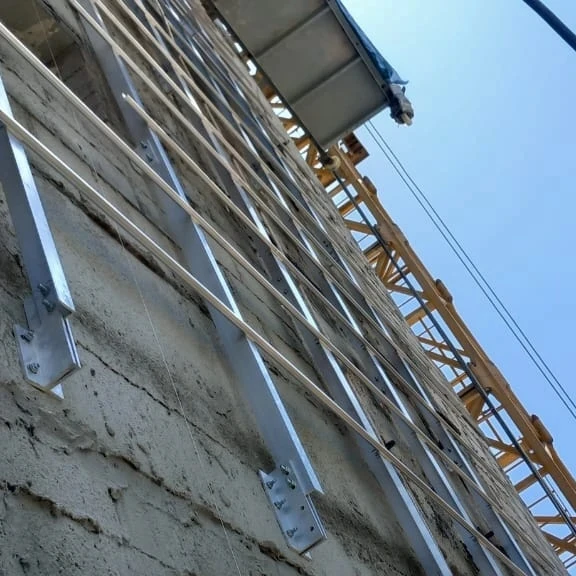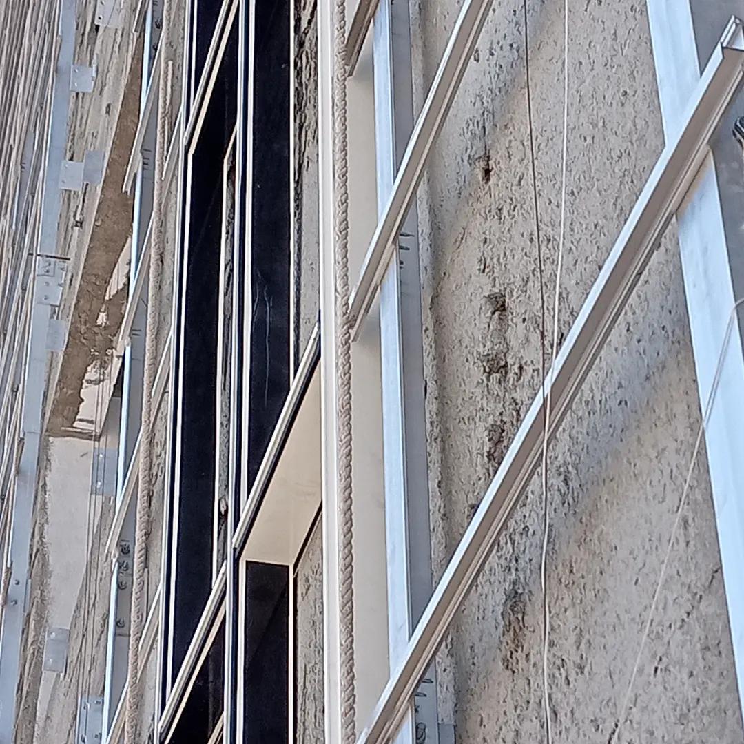 تركيب شبكة حديدية متكاملة من الزوايا والجسور (Brackets & Runners) المصممة لتحمل أوزان الكسوة الخارجية على ارتفاعات شاهقة.