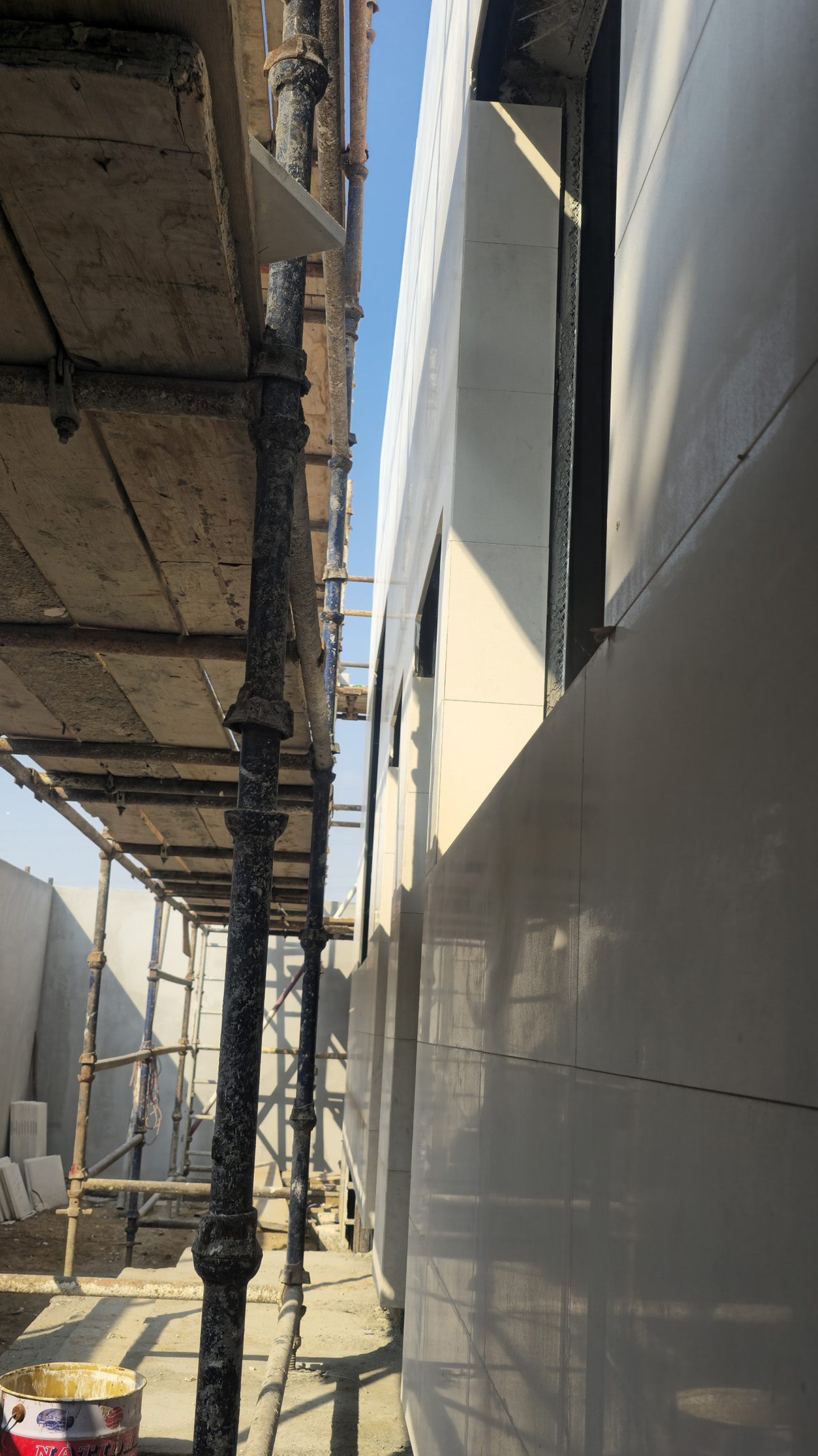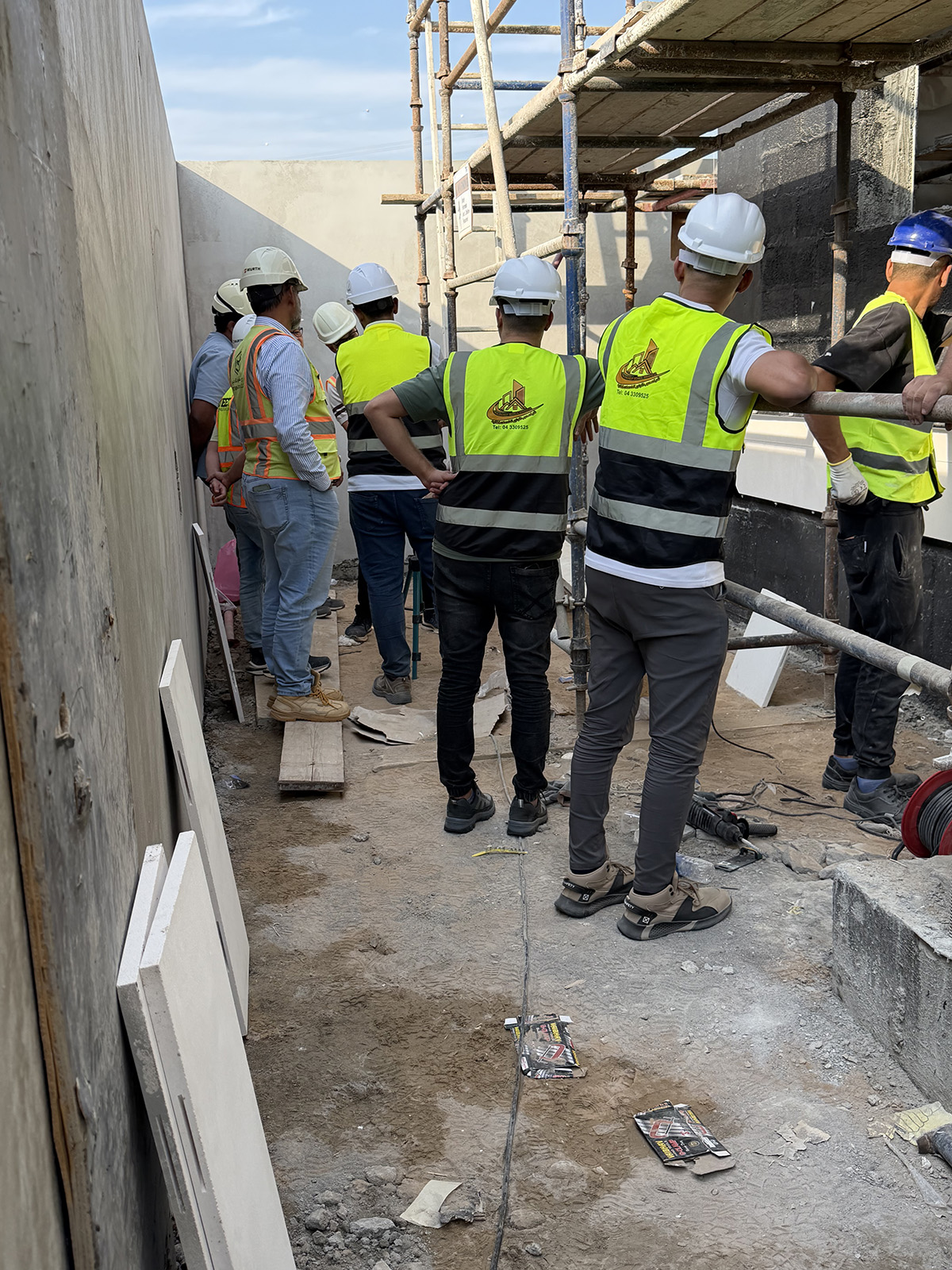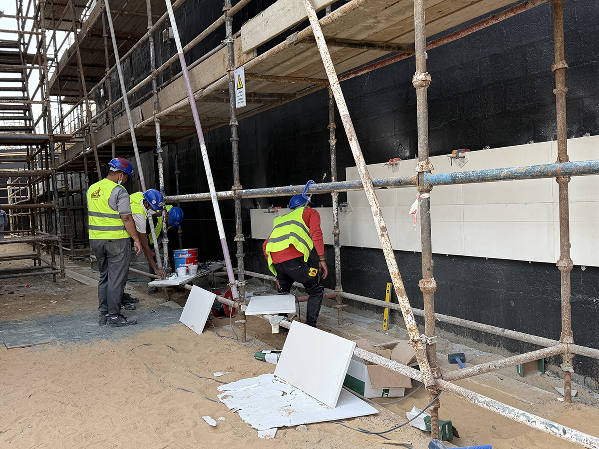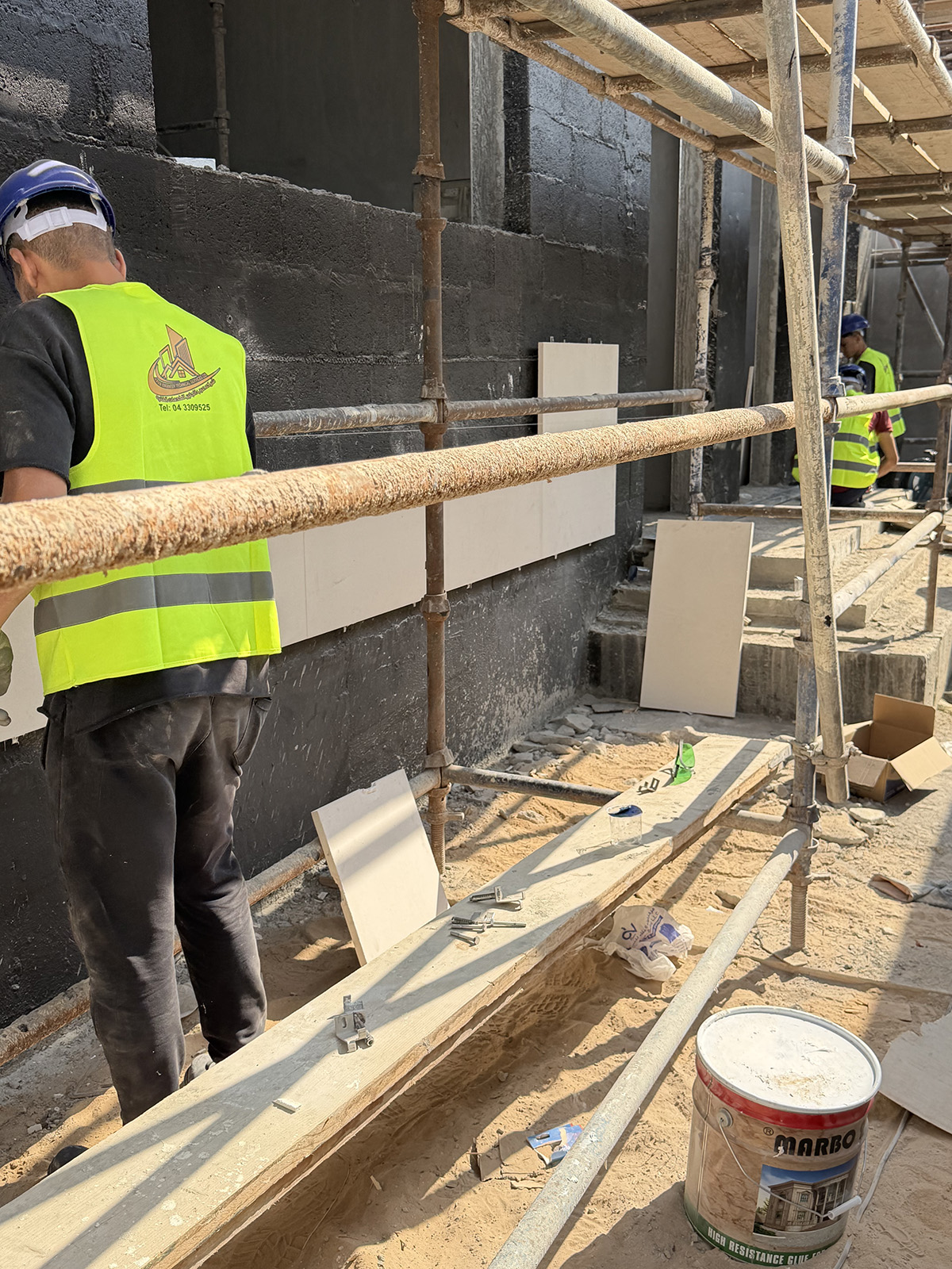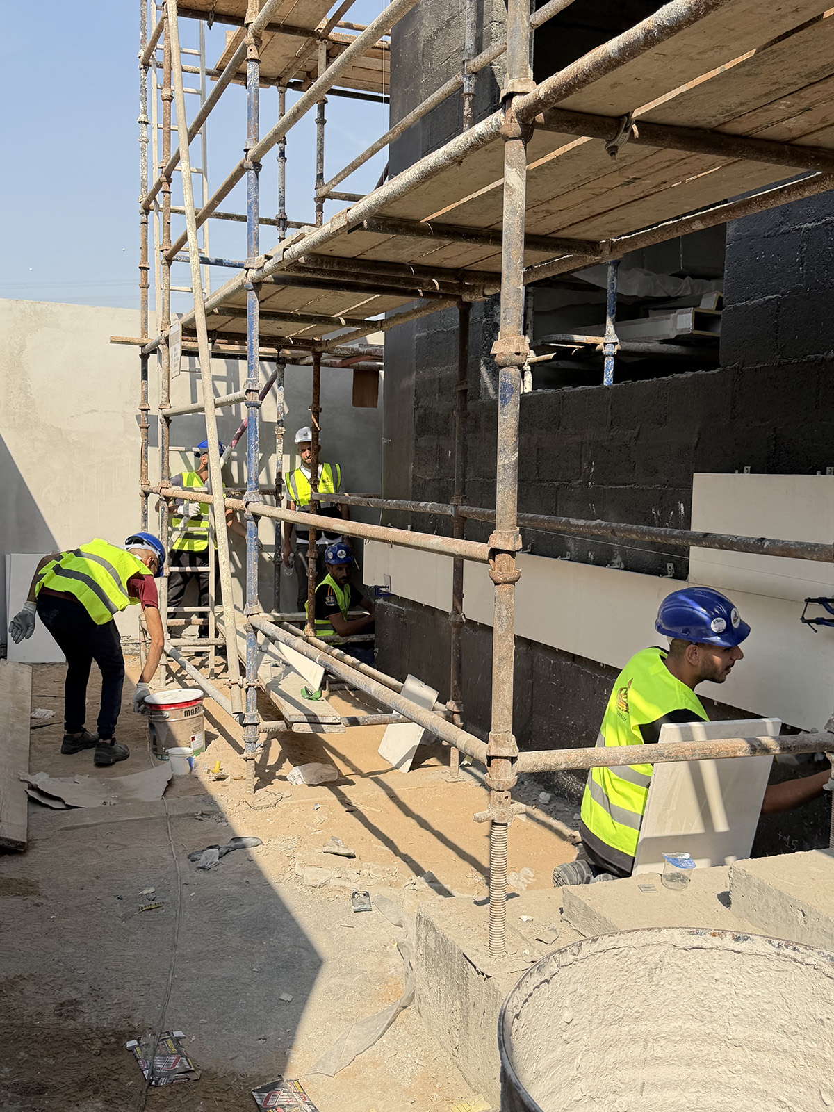 إدارة الموقع: العمل على 5 واجهات لمباني منفصلة في آن واحد، مما يتطلب تنسيقاً لوجستياً عالياً لضمان سرعة الإنجاز وتسليم الأعمال للمقاول الرئيسي (JEET) وفق الجدول الزمني المحدد.