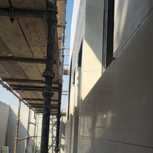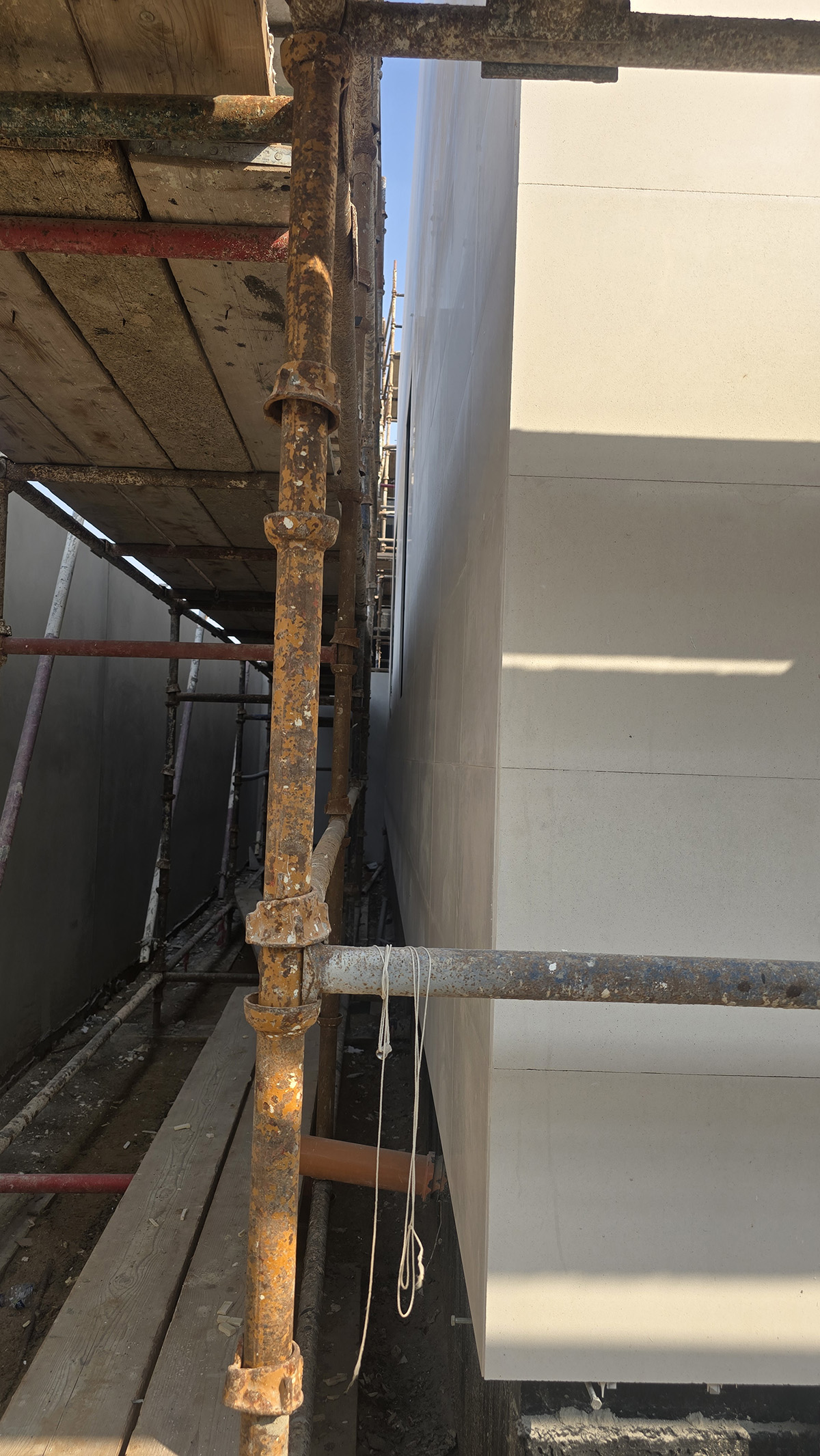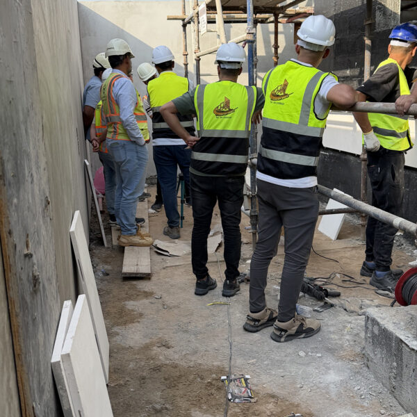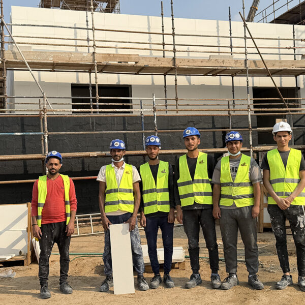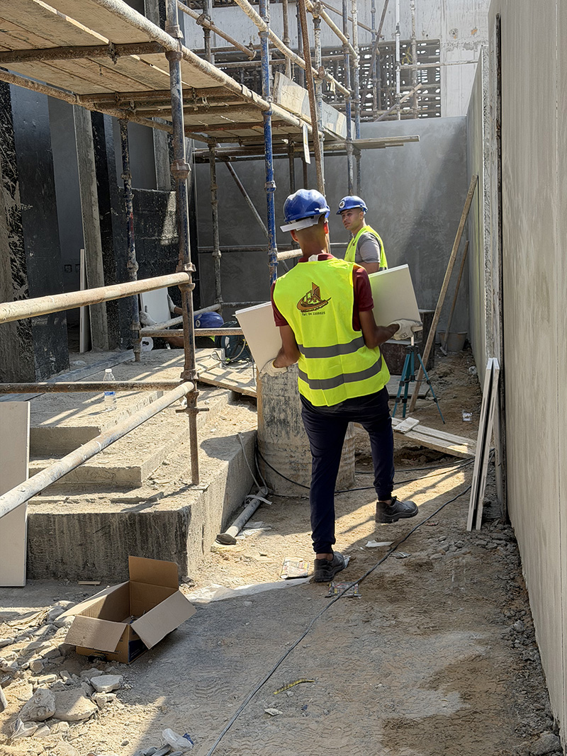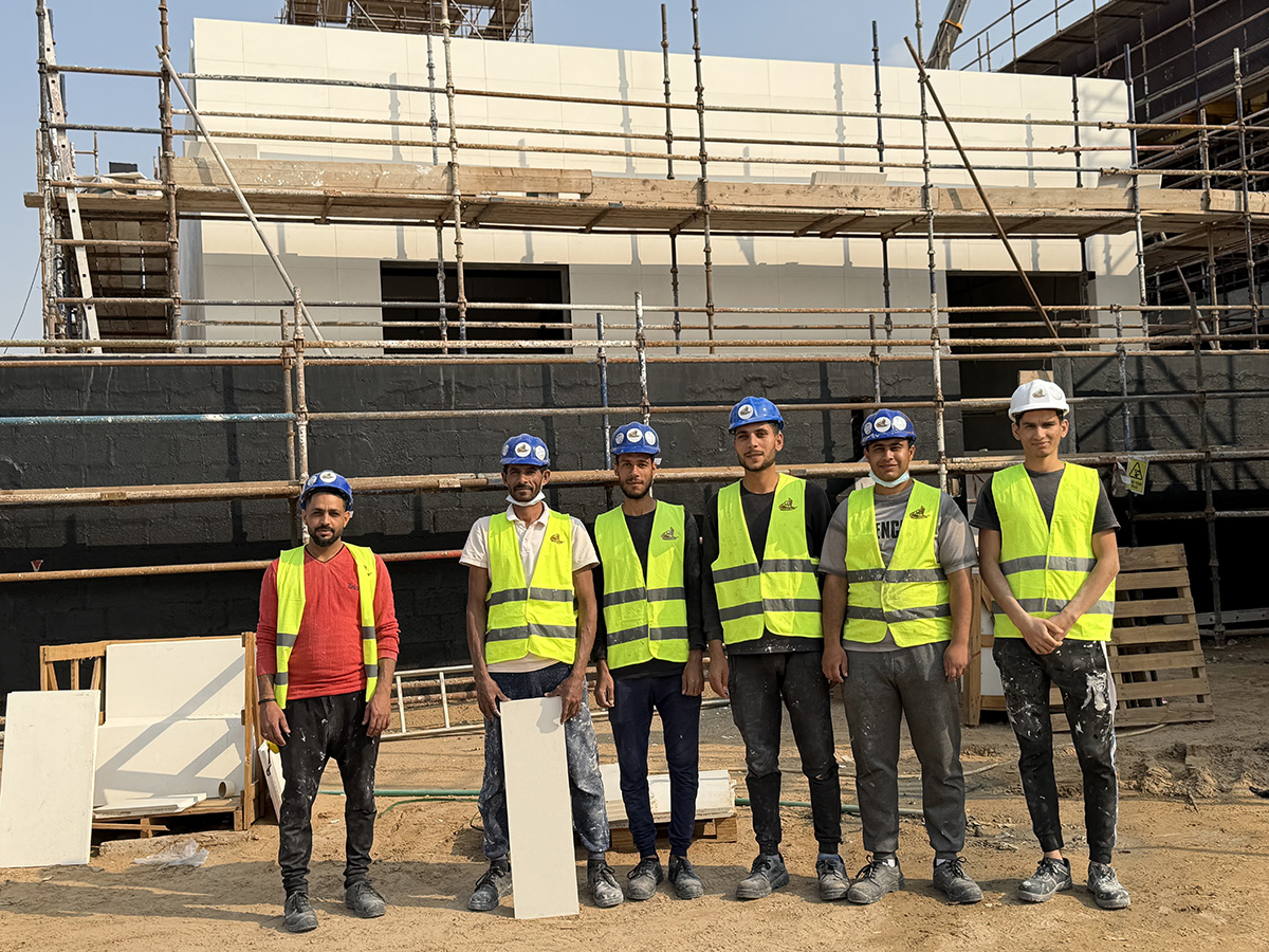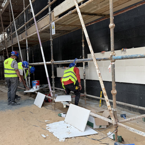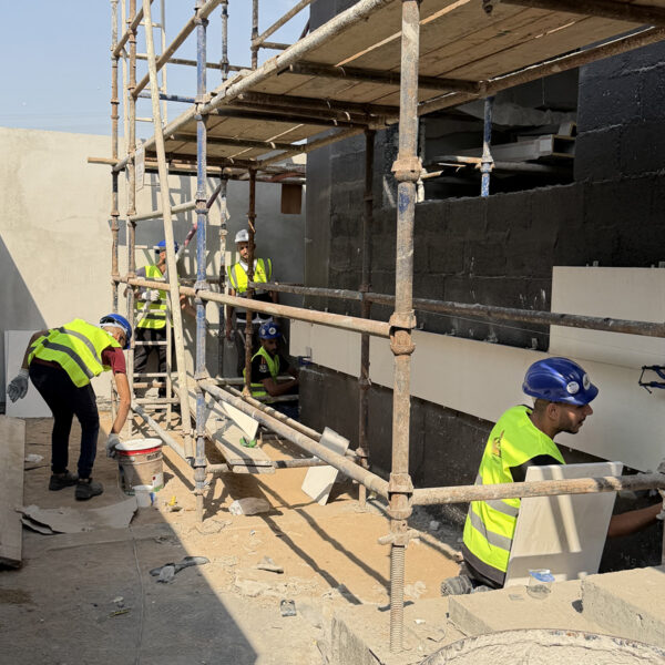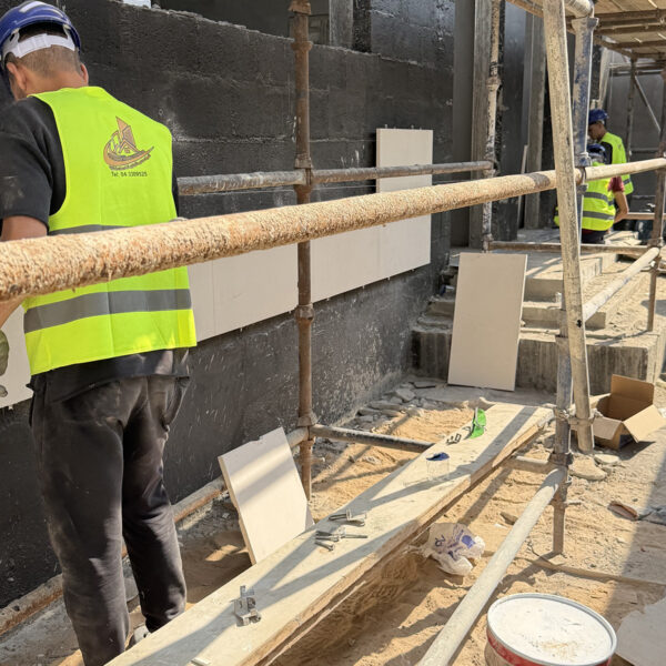 إدارة الموقع: العمل على 5 واجهات لمباني منفصلة في آن واحد، مما يتطلب تنسيقاً لوجستياً عالياً لضمان سرعة الإنجاز وتسليم الأعمال للمقاول الرئيسي (JEET) وفق الجدول الزمني المحدد.