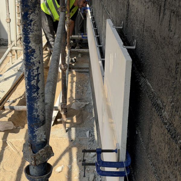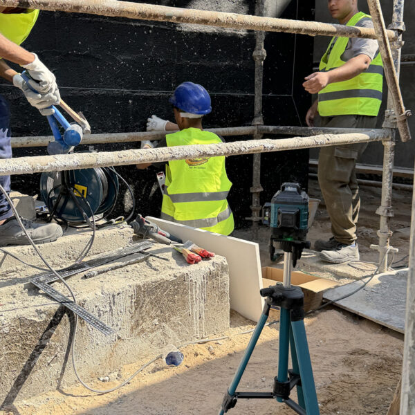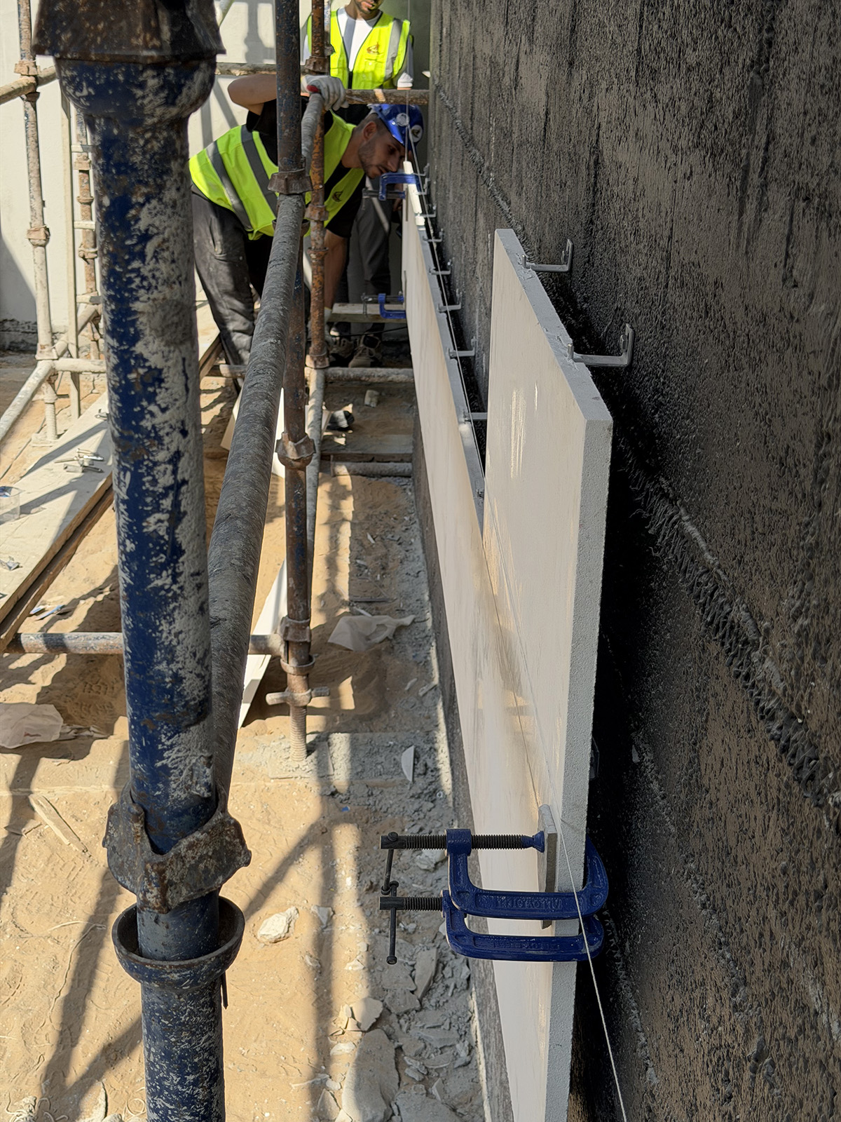 دقة التركيب والمحاذاة: ضمان استقامة الخطوط الحجرية (Joints) لتتناسب مع التصميم الهندسي الدقيق للمباني الخمسة.